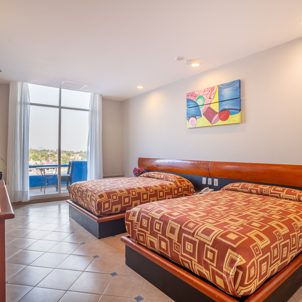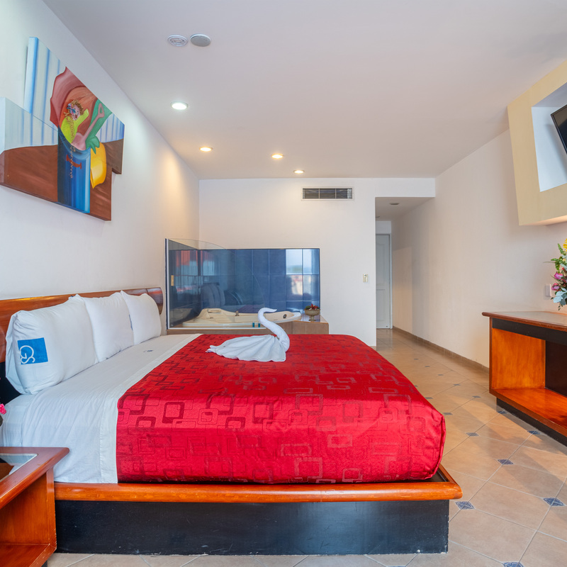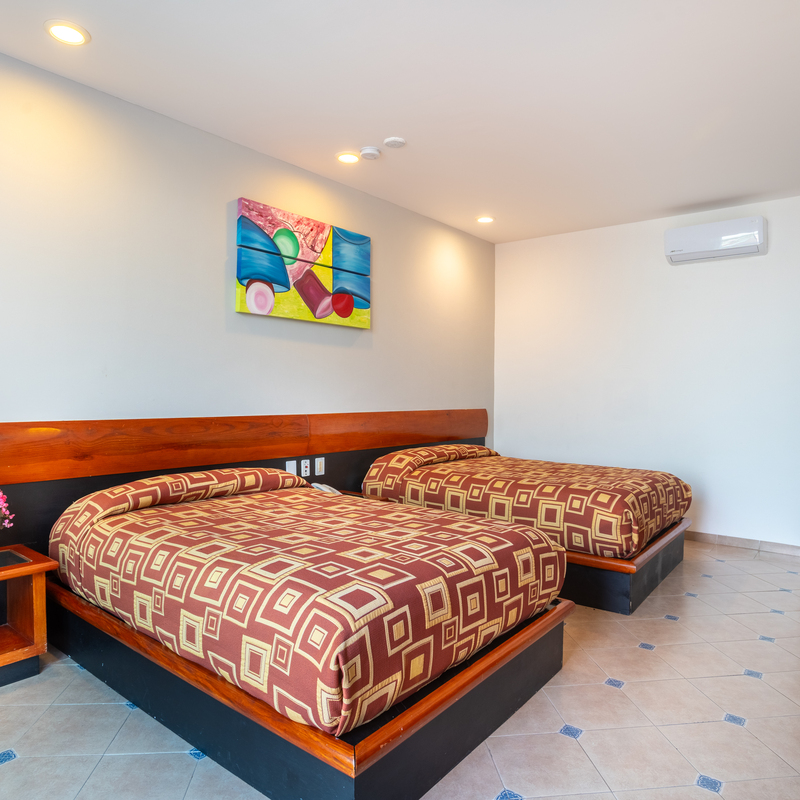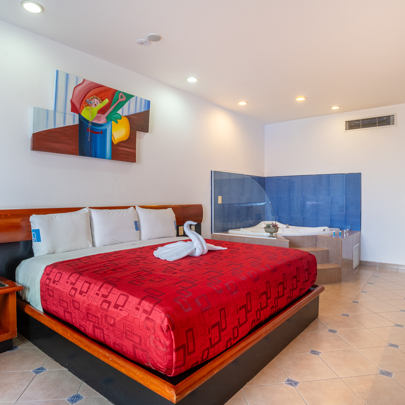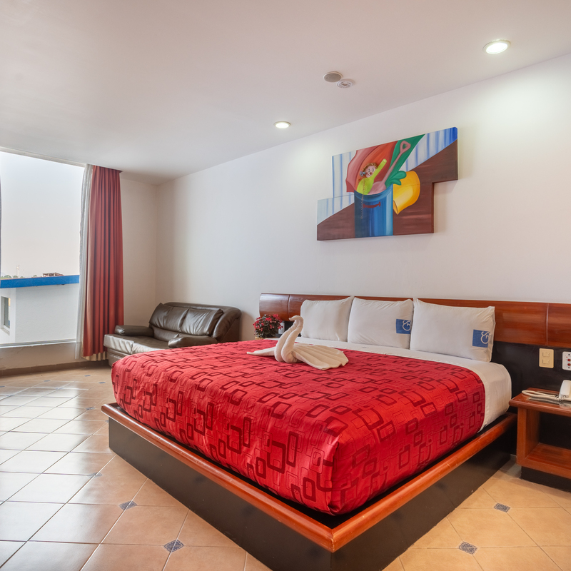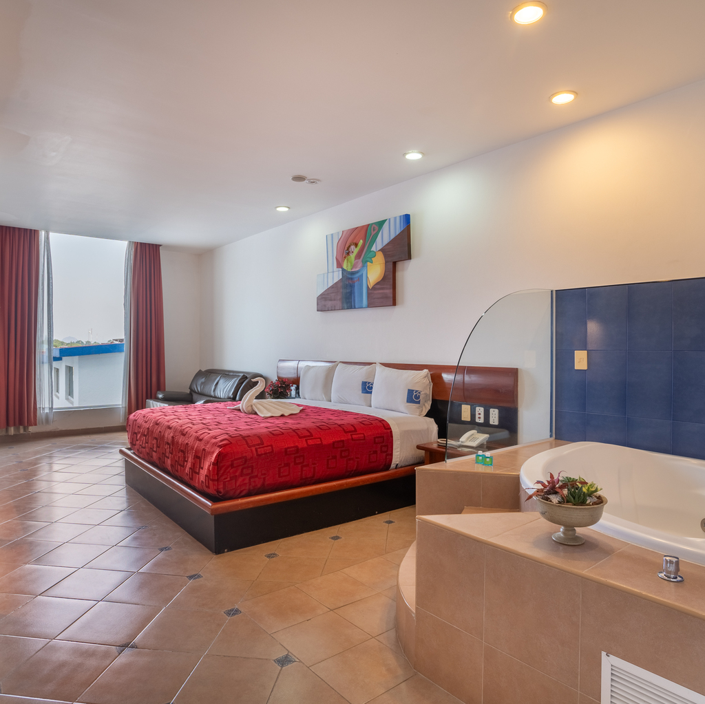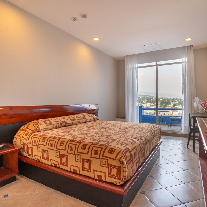 El espacio necesario para ti en modo individual o por pareja, incluye una cama King size, TV de pago, internet, equipado con guarda ropa, baño completo, algunas de estas habitaciones cuentan con balcón y una pequeña sala de estar además de aire acondicionado, estamos seguros de que la vas a disfrutar