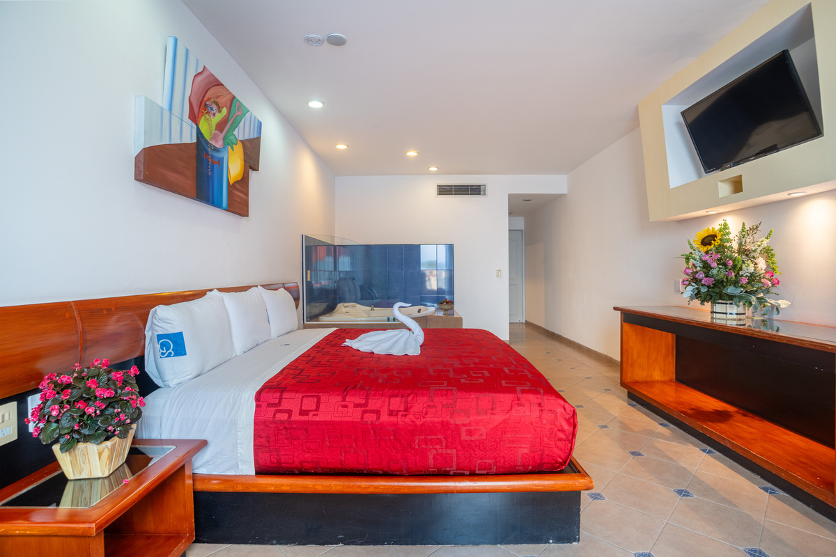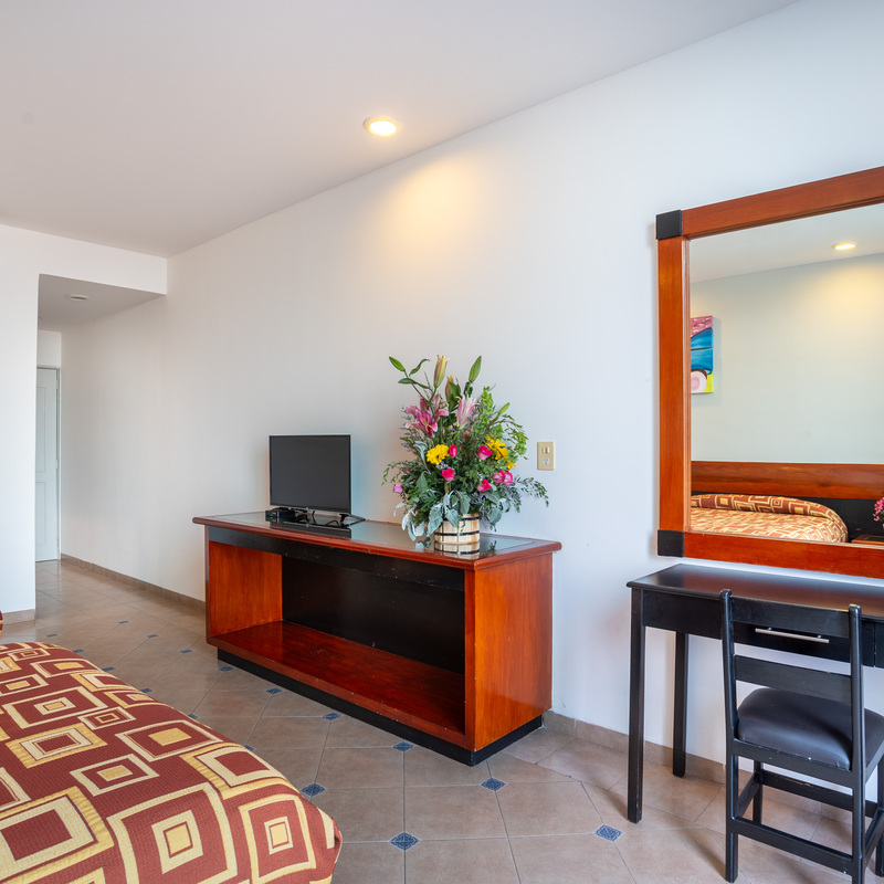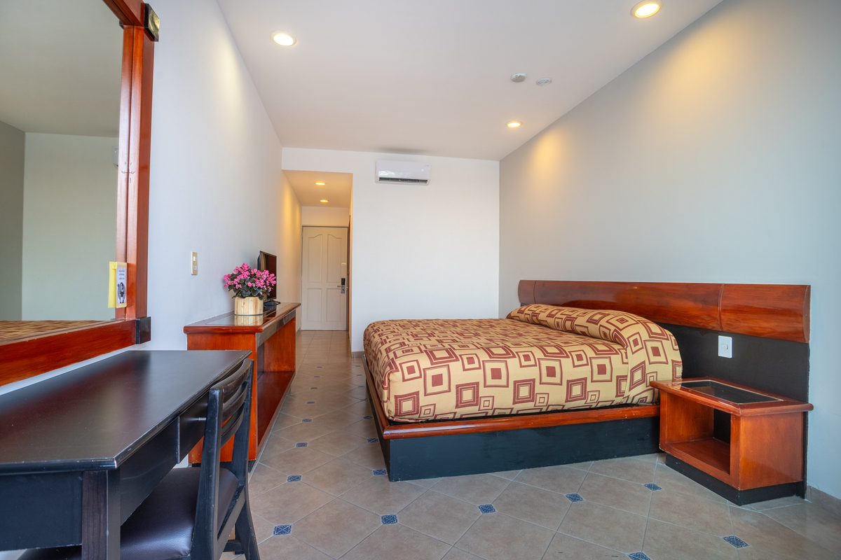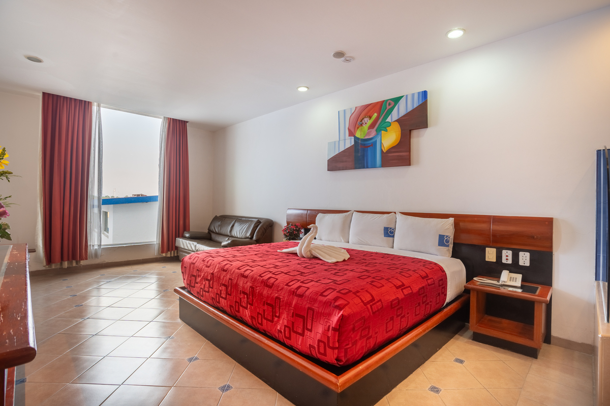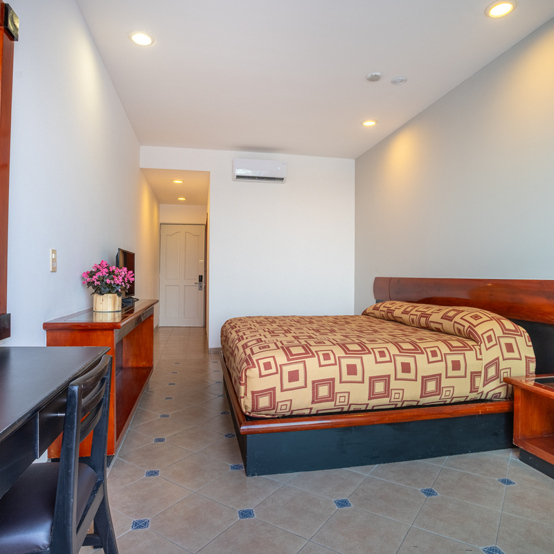 El espacio necesario para ti en modo individual o por pareja, incluye una cama King size, TV de pago, internet, equipado con guarda ropa, baño completo, algunas de estas habitaciones cuentan con balcón y una pequeña sala de estar además de aire acondicionado, estamos seguros de que la vas a disfrutar